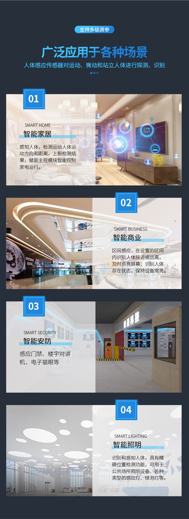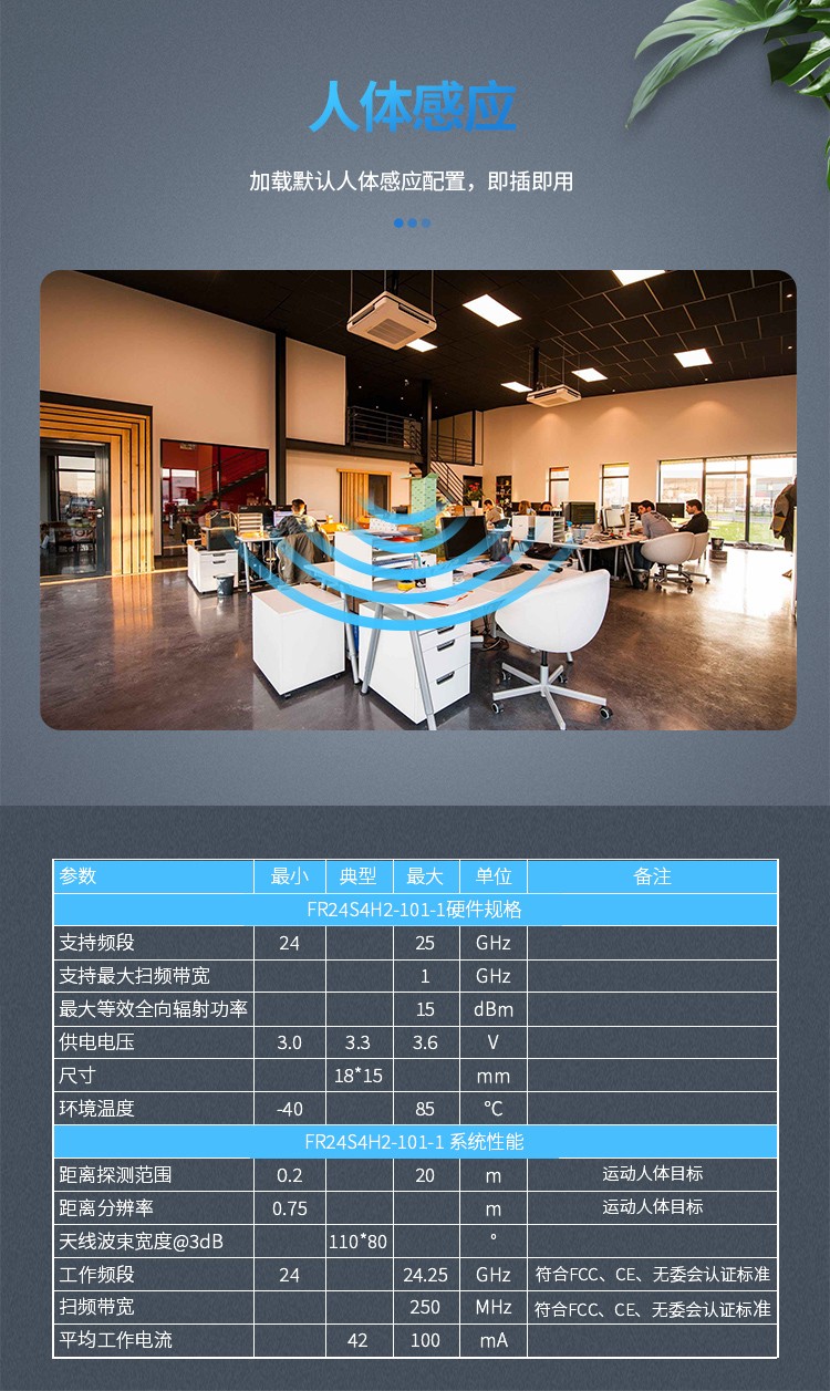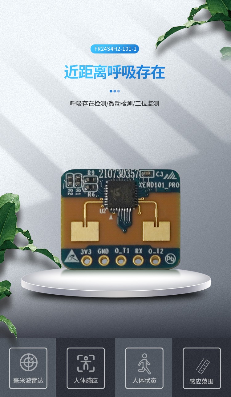 FR24S4H2-101-1 是飛睿智能設(shè)計(jì)的人體感應(yīng)傳感器,包含極簡(jiǎn)化 24G 雷達(dá)傳感器硬件和智能算法固件。硬件搭載高性能 24GHz 一發(fā)一收天線和外圍電路;人體感應(yīng)算法,采用毫米波雷達(dá)距離測(cè)量技術(shù)和高性能芯片先進(jìn)的專有信號(hào)處理技術(shù),實(shí)現(xiàn)對(duì)運(yùn)動(dòng)、微動(dòng)和站立人體的精確感知。固件主要應(yīng)用在室內(nèi)場(chǎng)景,感知區(qū)域內(nèi)是否有運(yùn)動(dòng)或者微動(dòng)的人體,實(shí)時(shí)刷新檢測(cè)結(jié)果。對(duì)運(yùn)動(dòng)人體的最遠(yuǎn)感應(yīng)距離為 20 米,可輕松配置感應(yīng)距離范圍、不同區(qū)間的感應(yīng)靈敏度及刷新時(shí)間,支持 GPIO 和 UART 接口,即插即用,靈活應(yīng)用于不同的智能場(chǎng)景和終端產(chǎn)品。